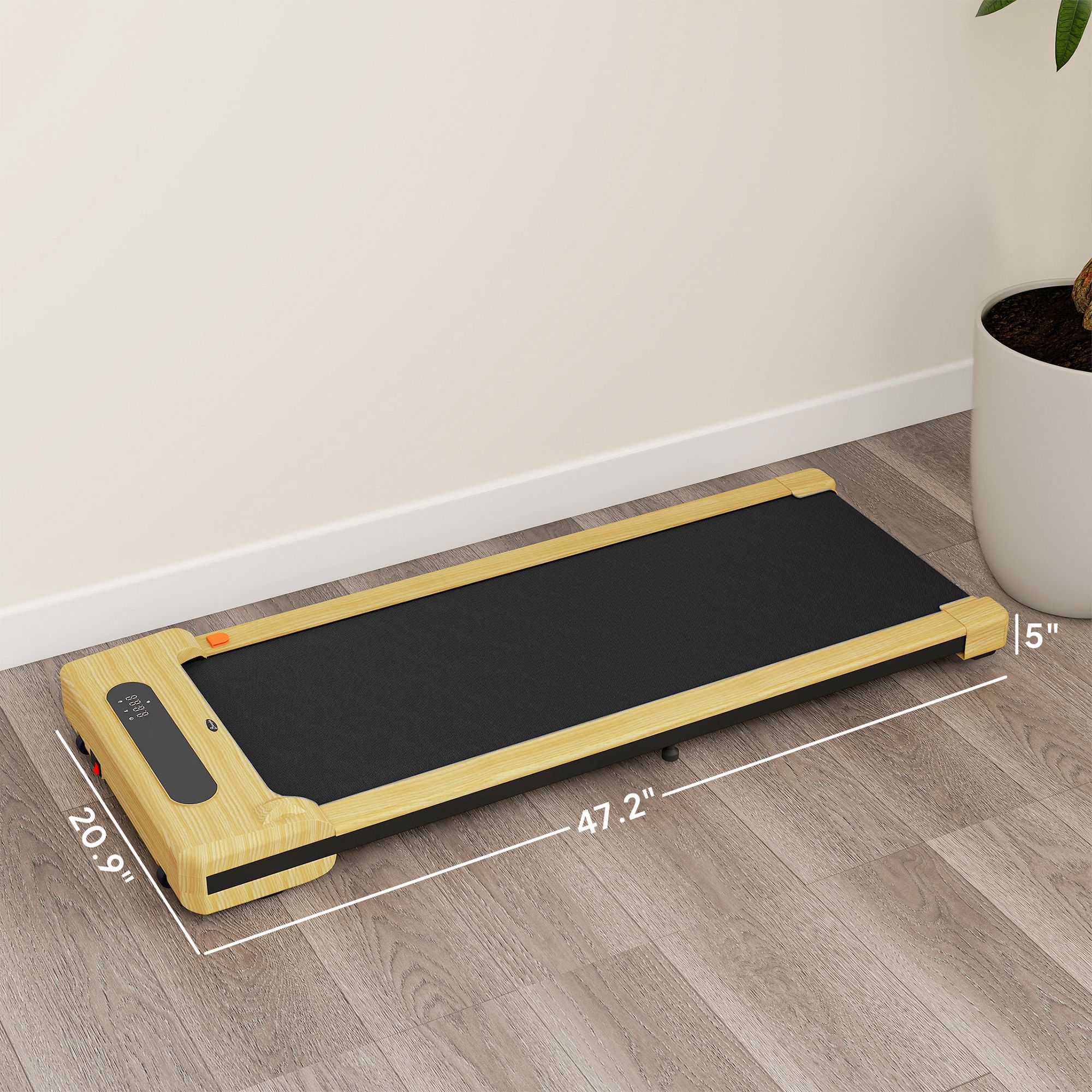 Step up your daily workout routine with this sleek walking pad treadmill from Soozier. A quiet 2.5HP motor and 5-layer anti-slip belt make for safe, comfortable walks. The compact treadmill's built-in LED screen helps you monitor time, speed, distance, and calories to keep you on track with your fitness goals. Natural wood accents and wheels for easy storage make this a great compact treadmill. Enjoy an effective and safe workout in the comfort of your home with the under desk walking pad!